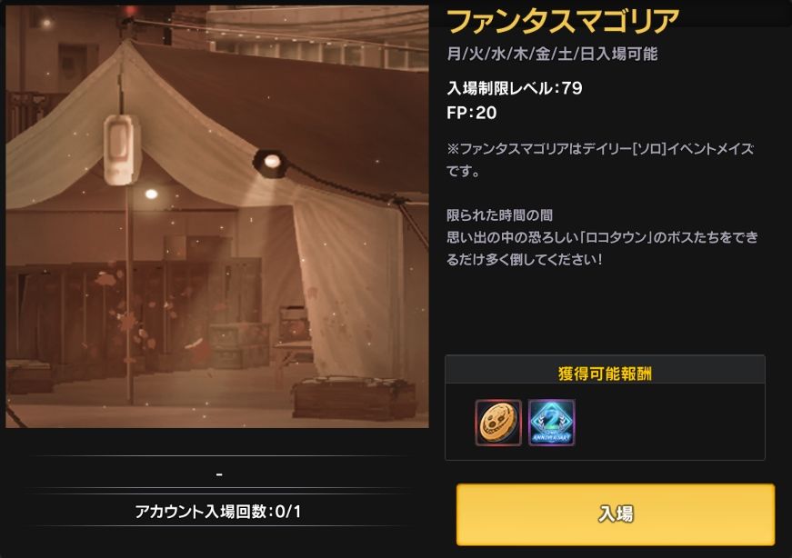 ・アカウントごとに1日1回まで報酬獲得が可能で、LV79以上のキャラクターが入場可能です。