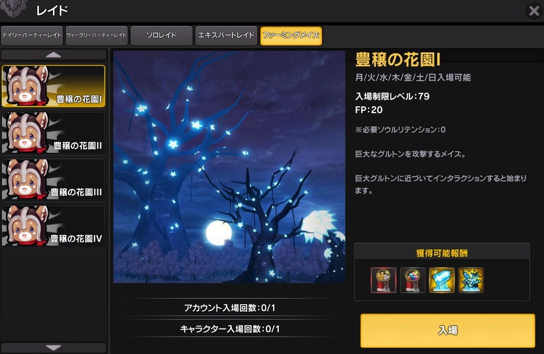 ・豊穣の花園は入場にFP10、メイズクリア時にFP10を消費します。