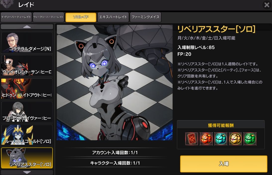 リベリアススター(ソロ)には画面右上のレイド入場ボタンから入場できます。